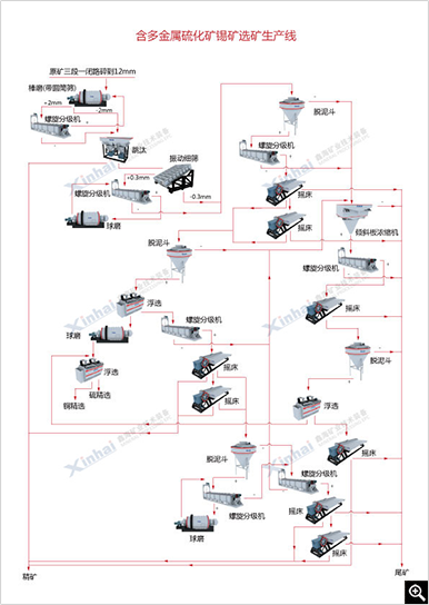 鑫海方案:该重选选矿工艺鑫海决定采用重介质预选、重选-浮选-重选联合流程。针对锡矿泥粒度细,沉降速度慢的特点,采用鑫海离心选矿机粗选,丢弃大量尾矿。此外采用鑫海6S摇床处理鑫海离心选矿机及粗、精选鑫海螺旋溜槽的尾矿,简化了生产流程,防止中矿恶性循环,极大限度地回收锡矿。较单一锡精矿的选别流程,鑫海重选工艺作业回收率提高5~10%,原矿回收率提高1.5~2.0%