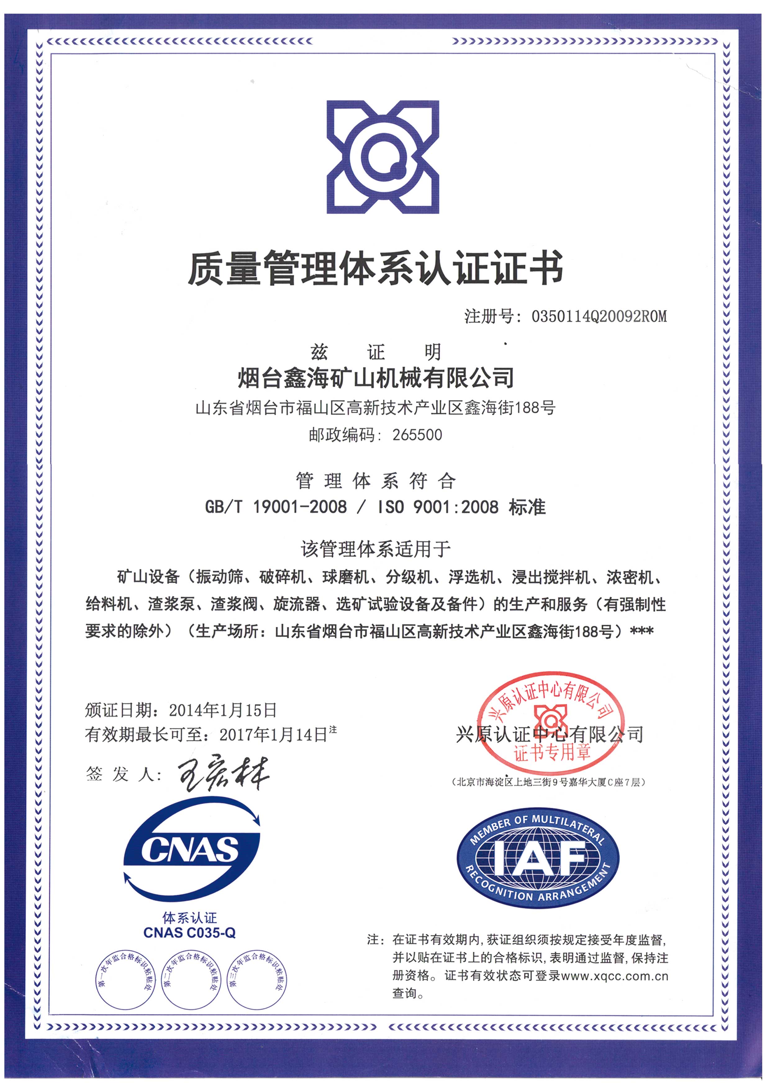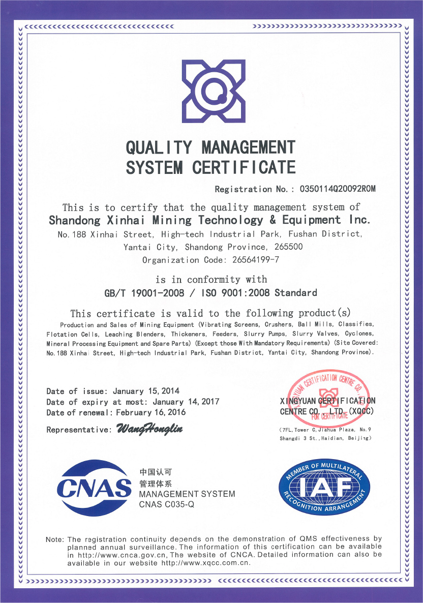 鑫海公司凭借着优质的产品,目前已取得了ISO9001:2015产品质量管理体系认证,被定为产品先进,质量达标,放心品牌!