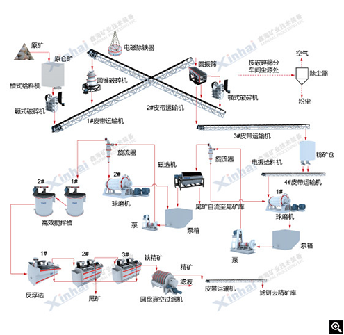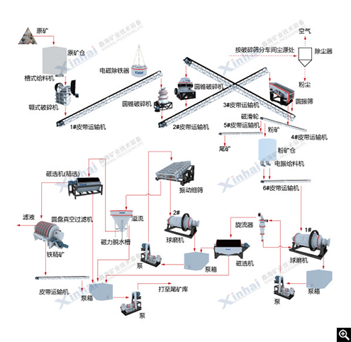 鑫海在对该项目铁矿进行选矿试验后,根据矿石性质特点,决定采用鑫海三段开路破碎,一粗、一精、一扫的磁选流程。原矿经过破碎磨矿后,磨矿产物返回分级机,构成一次闭路循环,粗粒中矿返回闭路循环,细粒返回原作业。之后分别采用鑫海永磁筒式磁选机进行一次粗选,一次精选以及一次扫选磁选作业,最终获得合格的铁精矿。