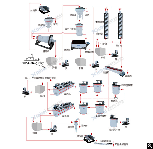 磁选法根据各种矿石或物料的磁性差异,在磁力及其他机械力作用下实现矿物最终分选。鑫海依托二十多年的选矿经验,在传统磁选工艺的基础上,不断加以研究创新,自主研发干湿式磁选设备,所有磁系均采用钕铁硼磁铁和大包角设计,不但提高了磁场强度和作用深度,还增加了磁翻转次数,提升30%矿物分离效率;并荣获多项发明专利,现已形成了完备的 鑫海磁选工艺体系。