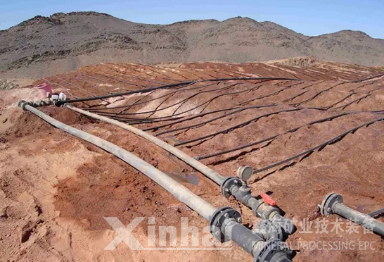 喷淋通常是喷头将管道系统输送来的溶液通过喷嘴喷射到空中,形成下雨的效果撒落在矿堆表面。