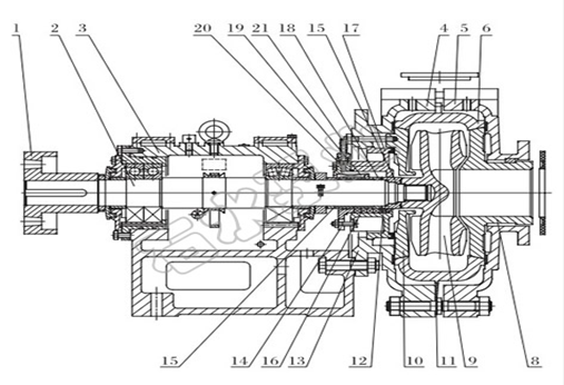 其中数字1是联轴器,数字2是轴,数字3是轴承组件,数字4为泵体,数字5为泵盖,数字6为护套,数字7是护套密封垫,数字8是前护板,数字9为叶轮,数字10为后护板,数字11是泵体螺栓,数字12是水封环,数字13为填料箱,数字14是对开填料压盖,数字15为轴套,数字16为填料,数字17为副叶轮,数字18代表减压盖,数字19为密封垫,数字20是水封接头。