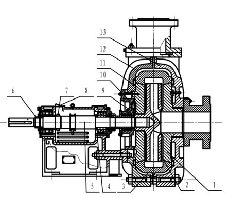 图中数字1为前护板,数字2为叶轮,数字3为护套,数字4为托架体,数字5为轴,数字6为螺母乙,数字7为调整螺母甲,数字8为调整孔盖,数字9为减压盖,数字10为付叶伦,数字11为后护板,数字12为泵体,数字13为泵盖。其中关键的结构为机体和叶轮。